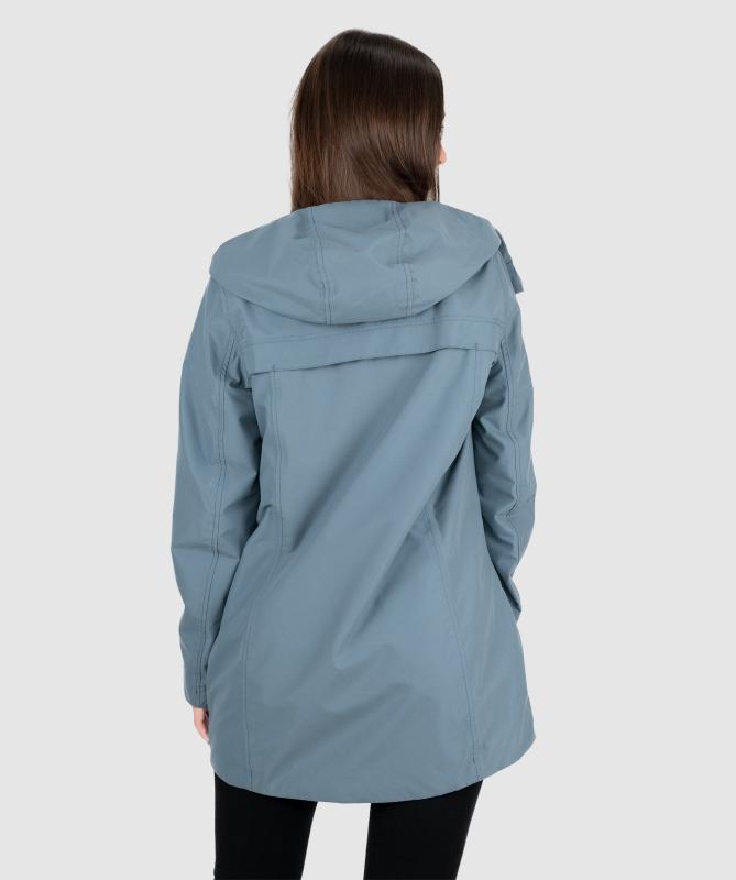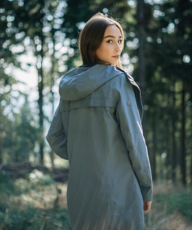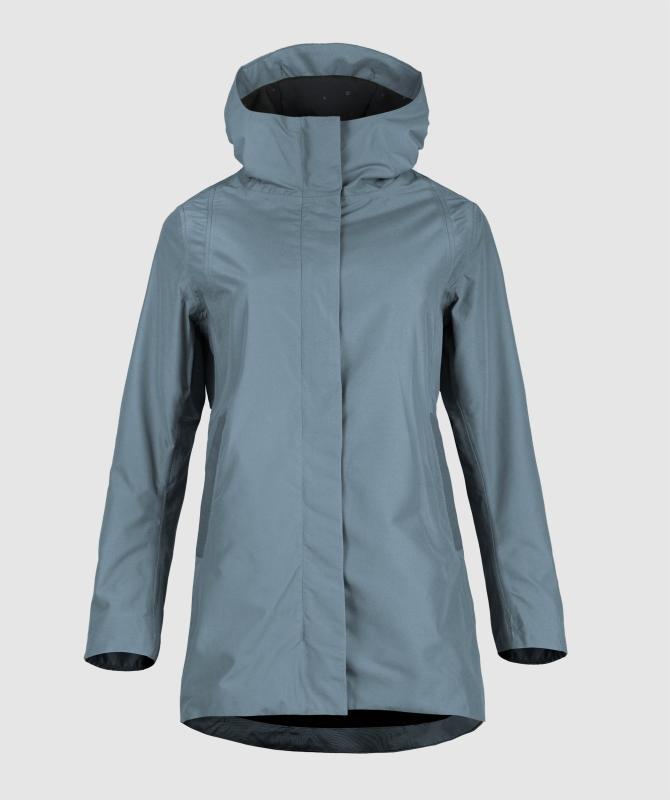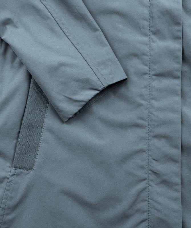 100% recyklovaný polyester, voděodolnost 8000mm, paropropustnost 3000g/m2/24h, povrchová úprava - DWR PFC free, wooxusní pružná podšívka, hlavní dvoucestný kovový zip překrytý klopou, hlavní lištové kapsy ukončené ozdobným lemem, odvětrávání zádech, vnitřní kapsa uzaviratelná na zip, tvarovaná spodní délka.