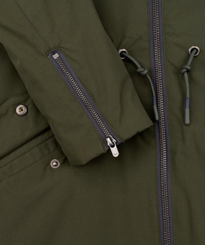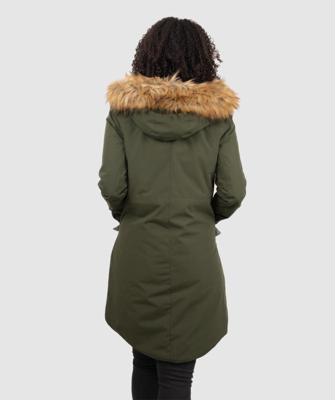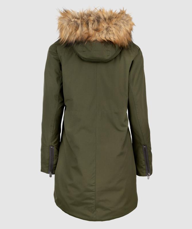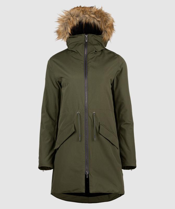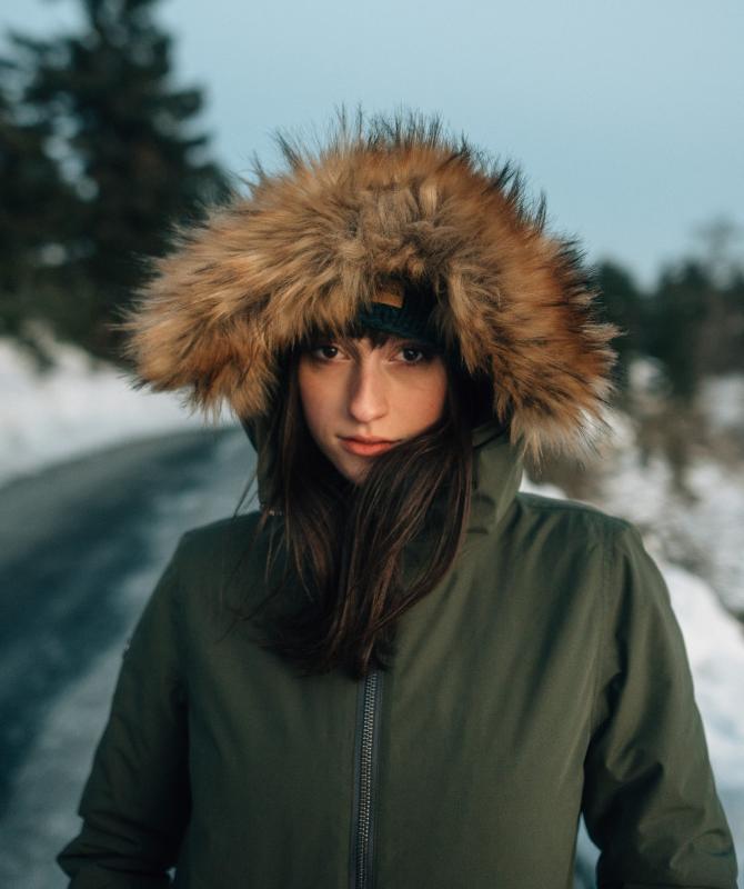 100% recyklovaný polyester, zateplenie Sorona DuPont, telo 120g, rukáv/kapucňa 80g, vodeodolnosť 8000mm, paropriepustnosť 3000/m2/24, prešívaná pružná podšívka z recyklovaného materiálu, podlepené švy, vnútorná kapsa uzatvárateľná na zips, bočné kapsy s patkou uzatvárateľné na druk, sťahovanie v páse, nastaviteľné rukávy so zapínaním na zips, odnímateľný kožušok na kapucni.