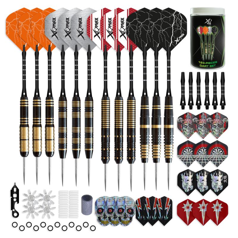 123-dielna sada XQMax šípky 12x Steel Brass + príslušenstvo – obsahuje 4 sady (po troch šípkach) steel - hlavný/barellov. Technický popis: