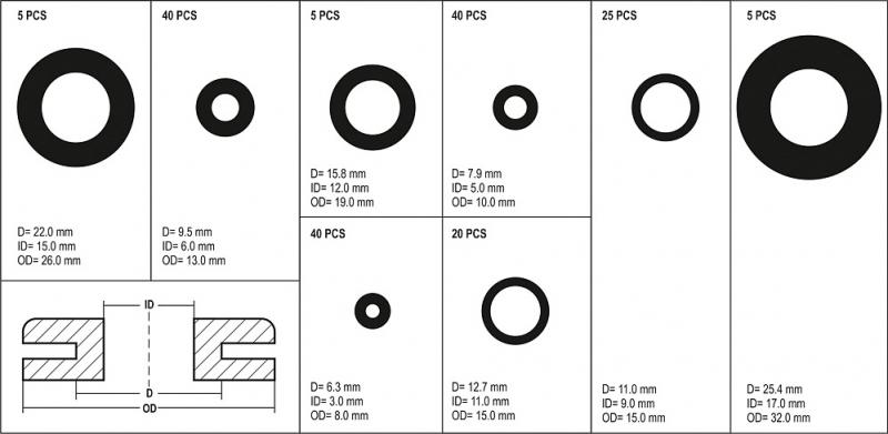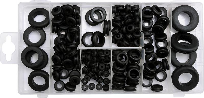 Sada 180 ks pryžových průchodek.Vše je přehledně uspořádáno v plastovém kufříku.