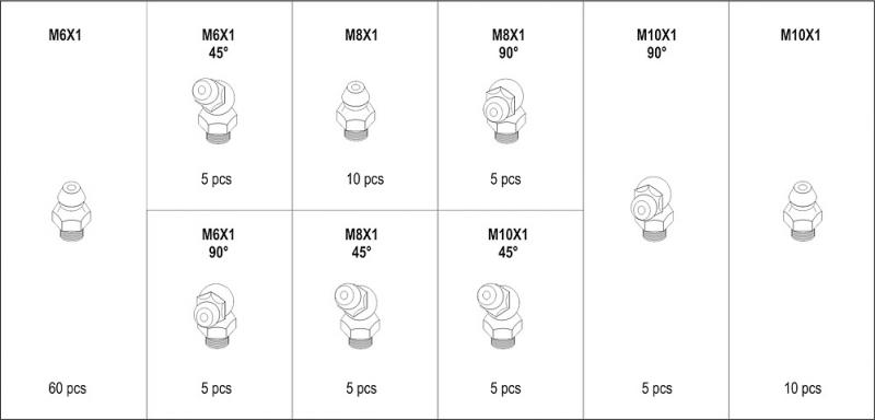 Sada obsahuje 110 kusů mazacích hlavic s metrickým závitem, nepostradatelných v garáži, zemědělství nebo průmyslu.Vše je přehledně uspořádáno v plastovém kufříku.