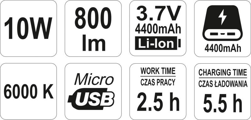 Energeticky úsporná, přenosná a bytelná COB LED svítilna kombinovaná s Powerbankou.Díky použití COB LED s výkonem 10W je zajištěn vysoký světelný tok 800lm a vysoká životnost zařízení. Světlo má barevnou teplotu 6000K (studená bílá). Samotná dioda je opatřena odolnou optikou, chránicí před mechanickým poškozením, usazováním prachu a jiných nečistot, ale i zlepšení charakteristiky osvětlení.