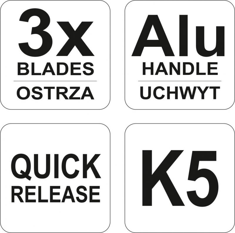 Souprava obsahuje 3 ks břitů z uhlíkové oceli K5. Tělo nástroje je zhotoveno z hliníku.