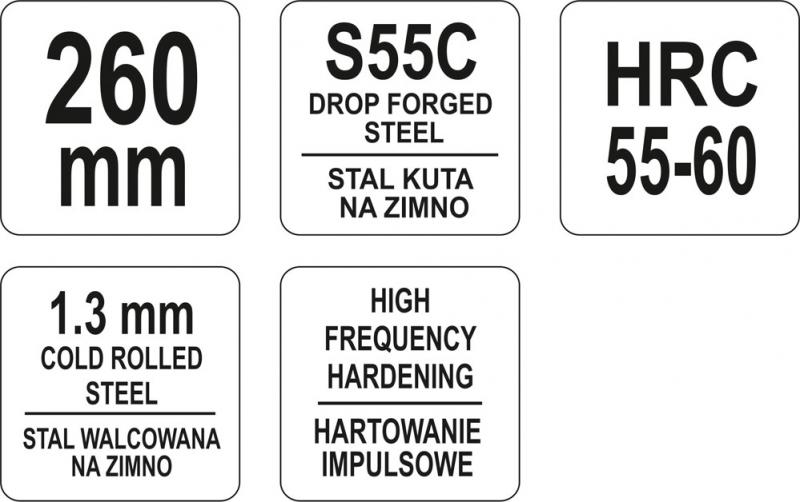 Nůžky německého typu jsou kované za studena z uhlíkové oceli se symbolem S55C HCS. Určeno pro řezání oceli do tloušťky 1,3 mm.