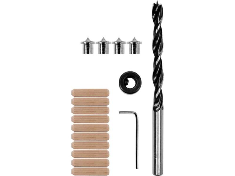 Sada obsahuje speciální vrták do dřeva, odpovídající hloubkový doraz s uzamykacím klíčem, značkovače a spojovací kolíky z bukového dřeva.