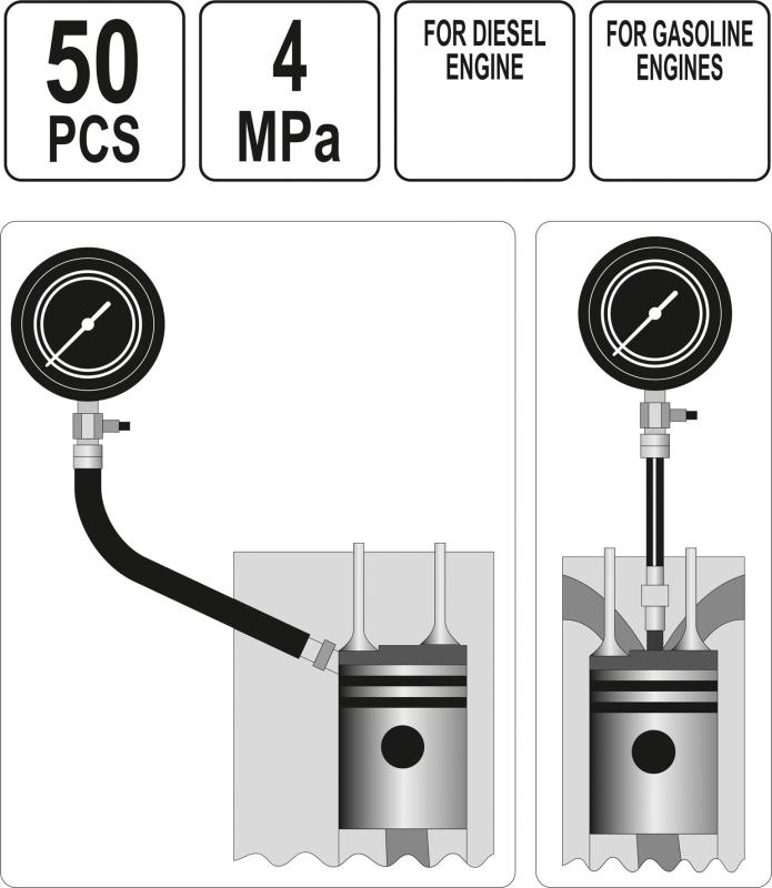 Určeno pro osobní automobily, dodávky, autobusy, traktory, zemědělská vozidla a dokonce i motorové čluny. Měření lze provádět v prostoru svíček případně vstřikovačů.