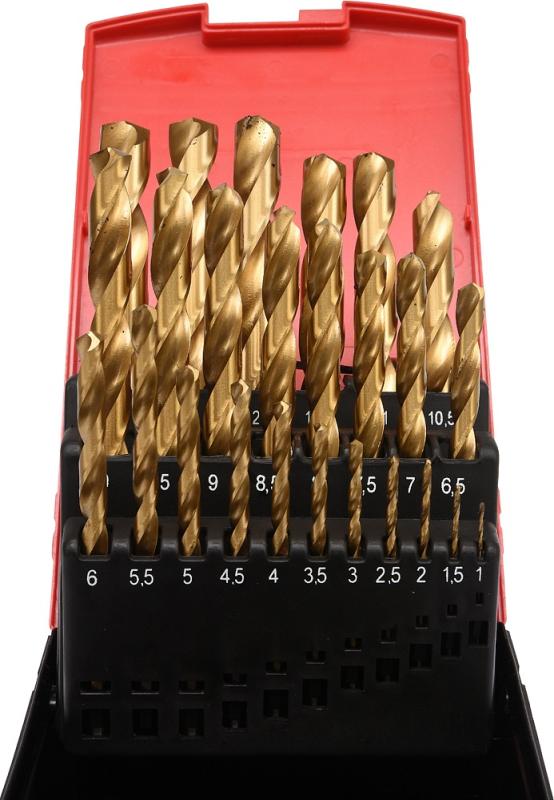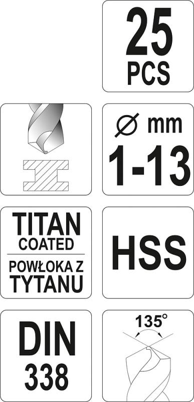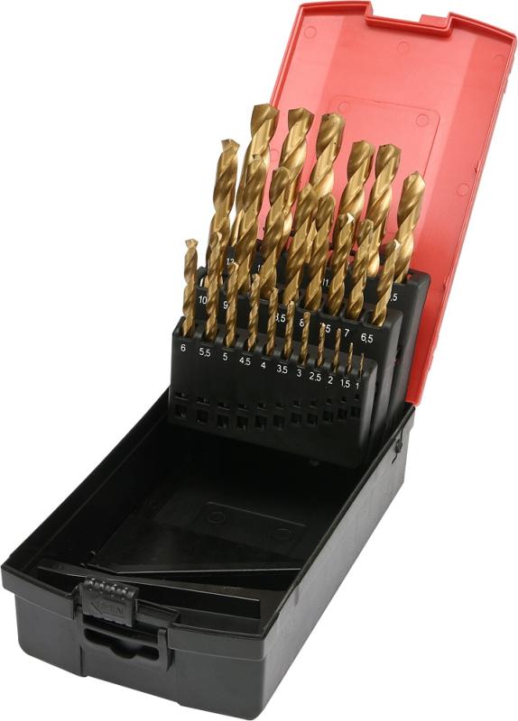 Sada se skládá z 25 ks vrtáků od 1 - 13 mm uložených v plechové krabičce.