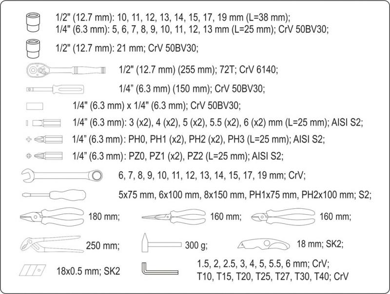 • Sadu stranových klíčů 6, 7, 8, 9, 10, 11, 12, 13, 14, 15, 17, 19 mm; CrV;