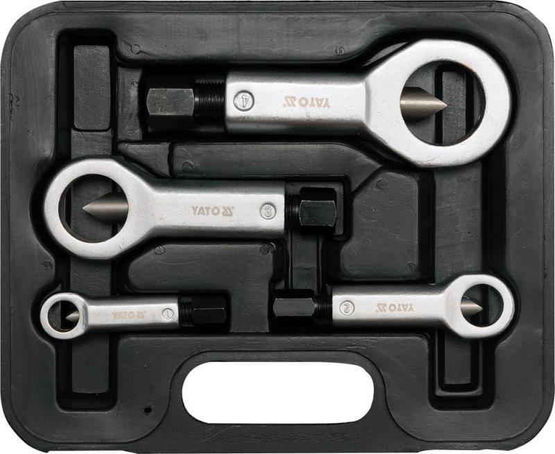 Sada přípravků pro demontáž poškozených a zrezlých matic.V soupravě jsou 4 odstupňované hlavice pro demontáž matic od 9 - 27 mm.