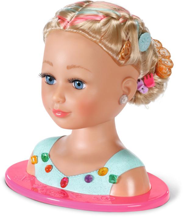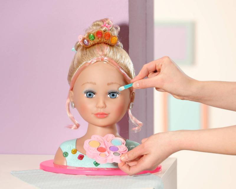 Blonďatá česací hlava blondýnka, v licenci Zapf Baby Born, pro všechny malé kadeřnice. Součástí make-up a kadeřnické doplňky.Vítejte v kosmetickém studiu pro malé princezny se smyslem pro ten nejlepší styl! Mladé make-up artistky mohou vytvářet ohromující make-up pomocí barevné a dermatologicky testované paletky s make-upem. Česací hlava s blonďatými vlásky prémiové kvality a jemnými barevnými melíry se snadno upravuje pomocí gumiček, sponek, skřipečků a kartáče. Ať už se budou tvořit romantické vlny, elegantní drdol nebo copánky a culíky – fantazii královských stylistů se meze nekladou. Vrchol elegance přichází ve formě jasně barevných nacvakávacích diamantů, kterými lze ozdobit třpytivou korunku nebo halenku. Jediné, co ještě chybí, jsou úžasné náušnice. A teď je princezna připravena oslnit všechny kolem.