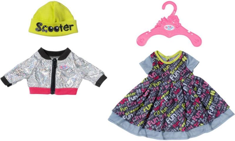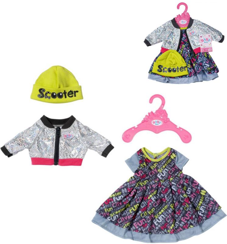 ZAPF Baby Born oblečení na skútr, obleček pro panenku mininko o velikosti 43cm. Součástí jsou šaty, bunda a čepice.Takový výlet do města není jen tak. Vždy je třeba zvolit vhodné a hlavně stylové oblečení. A přesně to splňuje tato souprava. Díky vrstveným šatům vypadá BABY born v rušných městských ulicích velmi elegantně.