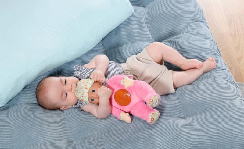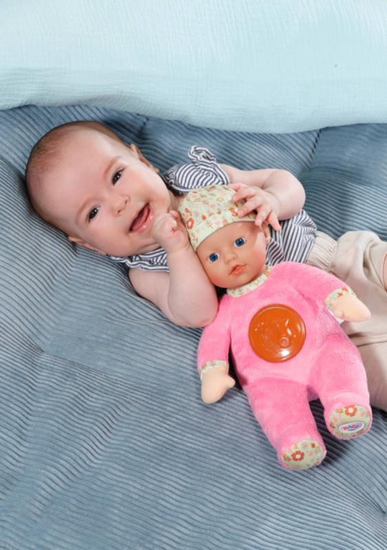 Uspávací panenka usínáček Baby Born for babies, pro nejmenší děti, pro miminko. Hračka na baterie, se světlem a zvukem. Velikost 30cm.Originální panenka BABY born. Děti si s panenkou mohou hrát a tulit se k ní, bude jim pomáhat v klidu usnout, zároveň je to skvělá panenka pro představení hry. Díky rozkošné panence "Svítí ve tmě" se z usínání stane dětská hra. Látkovou panenku ve velikosti 30cm můžete umístit do kolébky nebo do dětské postýlky těch nejmenších dětiček už od narození. Má měkké tělíčko a rozkošné plyšové dupačky. Stisknutím kolečka na bříšku se aktivuje noční světýlko s kačenkou a rozezní se uklidňující melodie. Měkkou vinylovou hlavičku panenky chrání čepička s roztomilým potiskem. Různé textury materiálů na panence povzbuzují malé děti k hraní a objevování. A když se děti rozhodnou ručičku nebo nožičku panenky použít jako kousací kroužek, panenka se dá jednoduše vyprat v ruce, stačí z ní jen vyjmout zvukový modul. Věk 0+