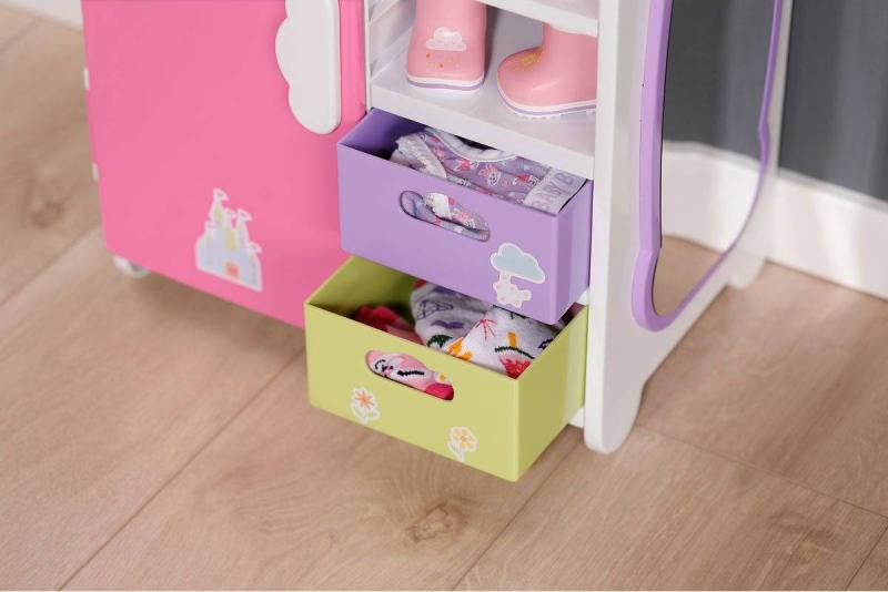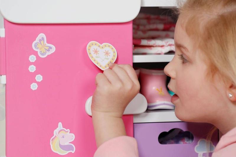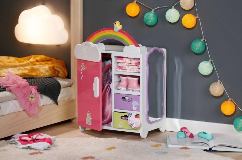 S duhovou šatní skříní BABY born je převlékání skvělá zábava! Když je kačenka Berta tlačena po duze, duha se rozsvítí. Berta hraje při vybírání outfitu veselou melodii, která jí dodává dobrou náladu. Díky šatní tyči, poličkám a zásuvkám je ve skříni dostatek místa na oblečení pro panenky. Kabelky nebo jiné věci na zavěšení lze pověsit na roztomilé háčky ve tvaru obláčků na vnější straně skříně. Kompletní outfit BABY born můžete obdivovat ve velkém zrcadle. Samotnou šatní skříň lze pomocí archu samolepek ještě více vyzdobit.