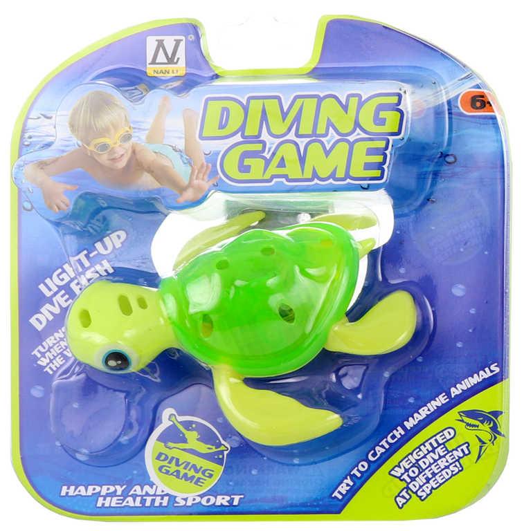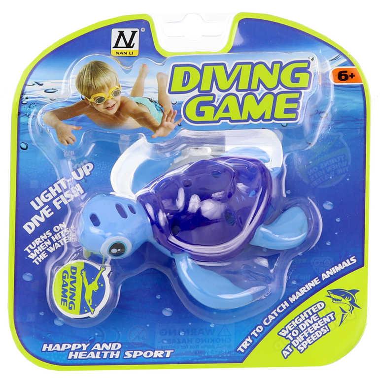 Veselá vodní želvička na potápění do vody. Po vložení do vody svítí a lze ji najít a vylovit. Vhodné pro zpestření plaveckého a potápěčského výcviku nebo využití v domácím bazénu (pod dozorem dospělého). Hračka ve třech barevných variantách, na baterie, se světlem. Baleno na kartě.