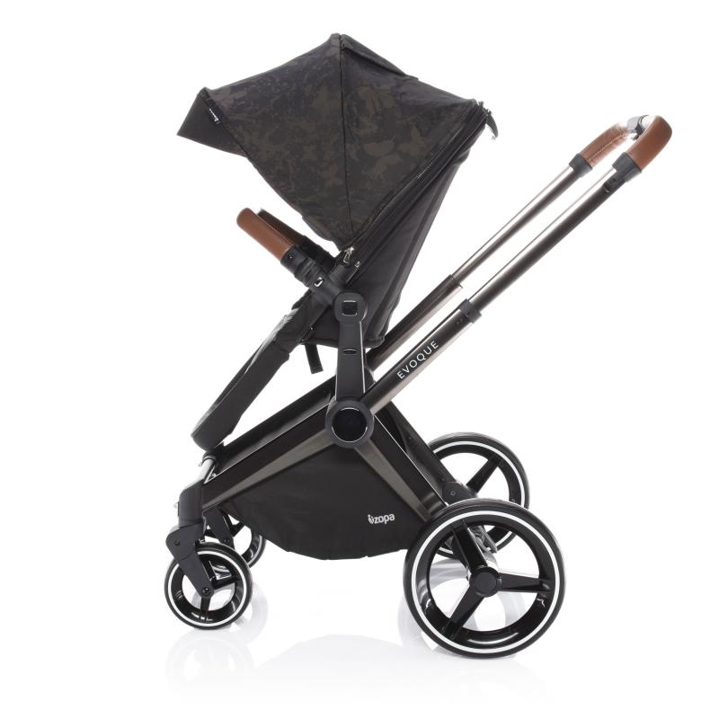 Kočárek Zopa Evoque je designový ale zároveň praktický kočárek pro děti od narození do 15 kilogramů. Jedná se o dvojkombinaci, kdy se z rámu prostorné, hluboké korby vytvoří sportovní sezení. Sportovní sedačka je polohovatelná a lze umísti po i proti směru jízdy. Dítě chrání pětibodový bezpečnostní pás.Kvalitní jízdu zajistí velká, odpružená zadní kola o průměru 29,5 centimetrů. Kočárek nabízí i funkci jízdy po dvou kolech, pro jízdu v písku nebo pro usnadnění jízdy po schodech. Přední kolečka mají automatickou aretaci a jsou také odpružená.Samozřejmostí je pak výškově nastavitelná rukojeť, která je stejně jako odnímatelná hrazda potažena ekokůží. Kočárek lze snadno složit. Podvozek i ve složeném stavu sám stojí, proti rozložení ho jistí pojistka.