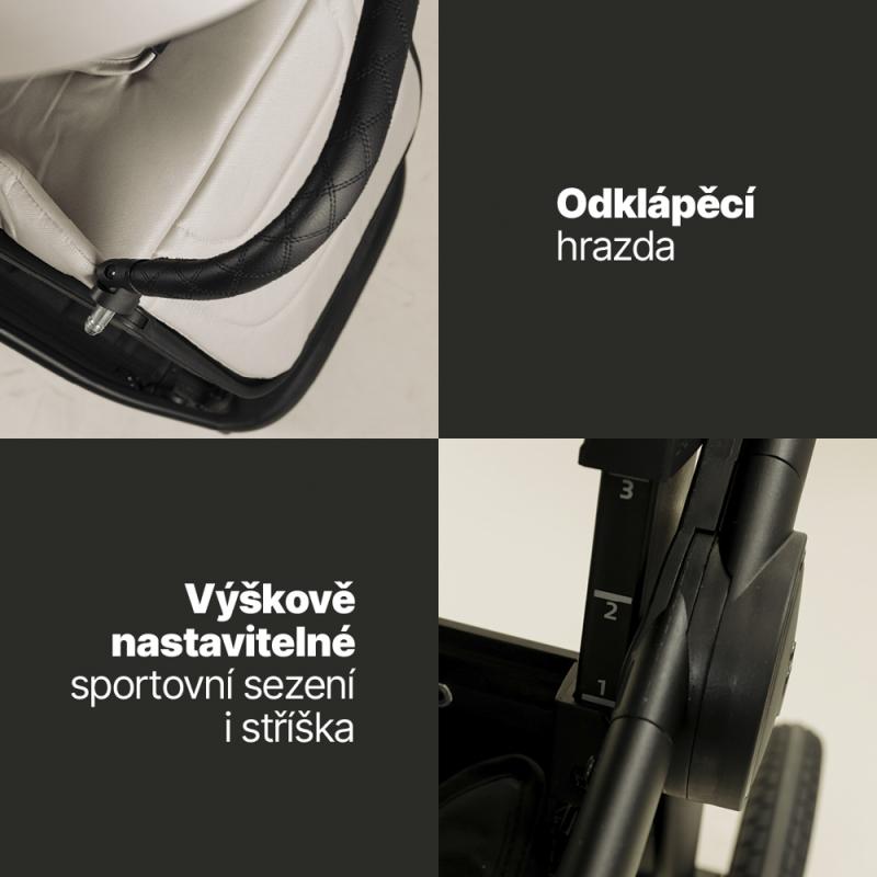 Kočárek umožňuje otočné sportovní sezení, které můžete nasměrovat po i protisměru jízdy. Velkou výhodou je výškově nastavitelné sezení i stříška, každá ve